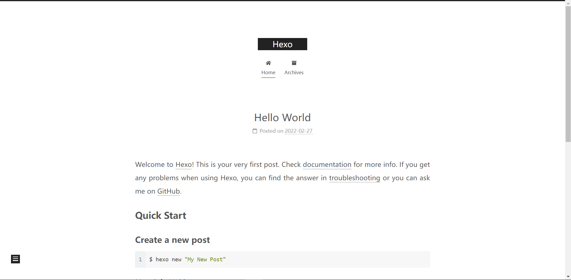 hexo s # 启动服务 默认为4000端口 [-p]指定启动端口服务启动完成后在浏览器输入 http://localhost:4000 就可以看到博客页面了 👍