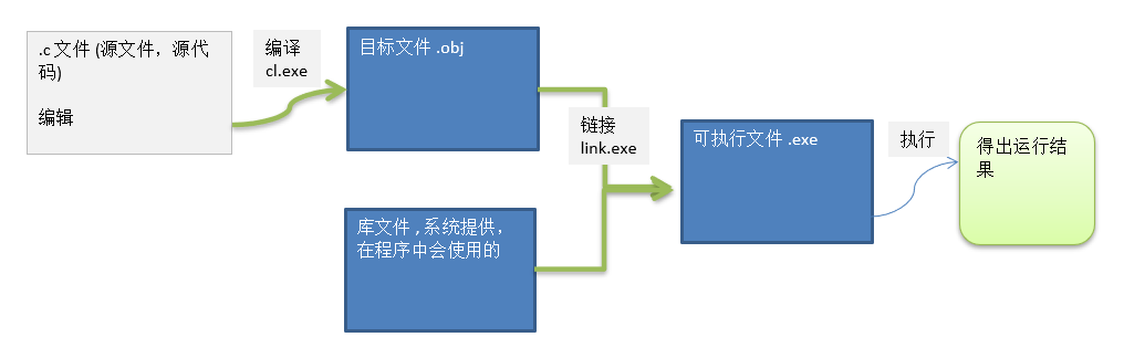 - 将目标文件(.obj文件),通过 链接程序 与 C库文件 链接成 .exe(可执行文件)